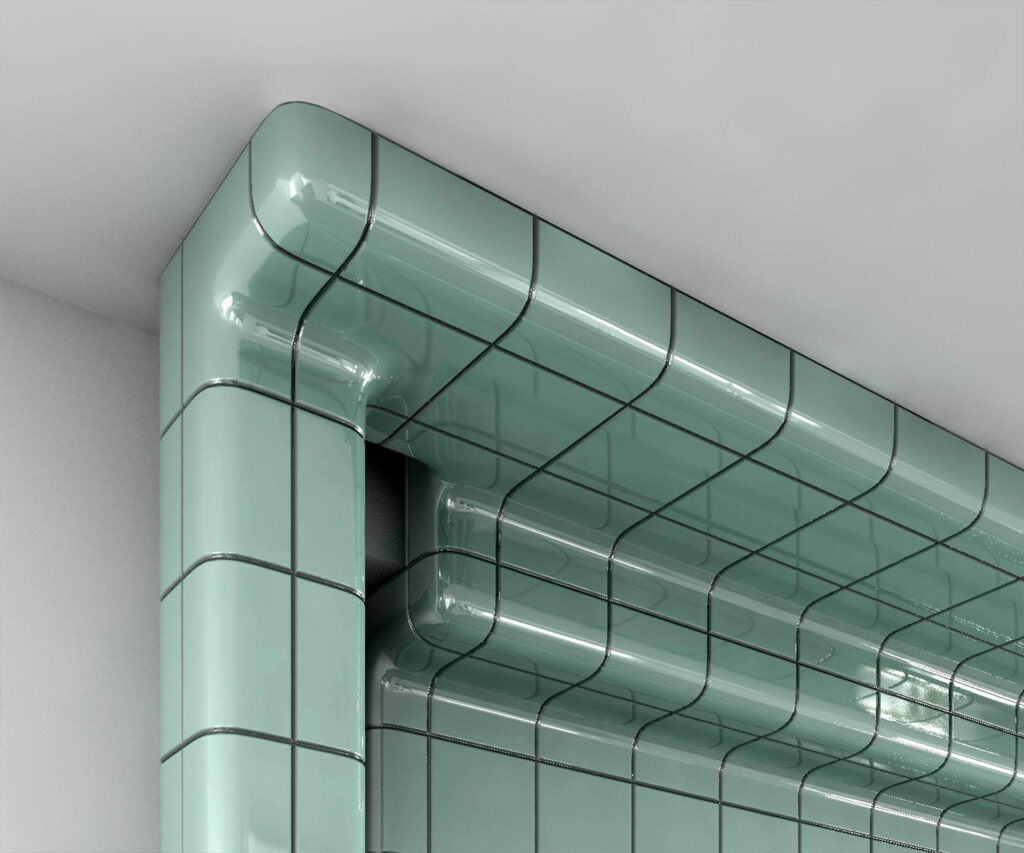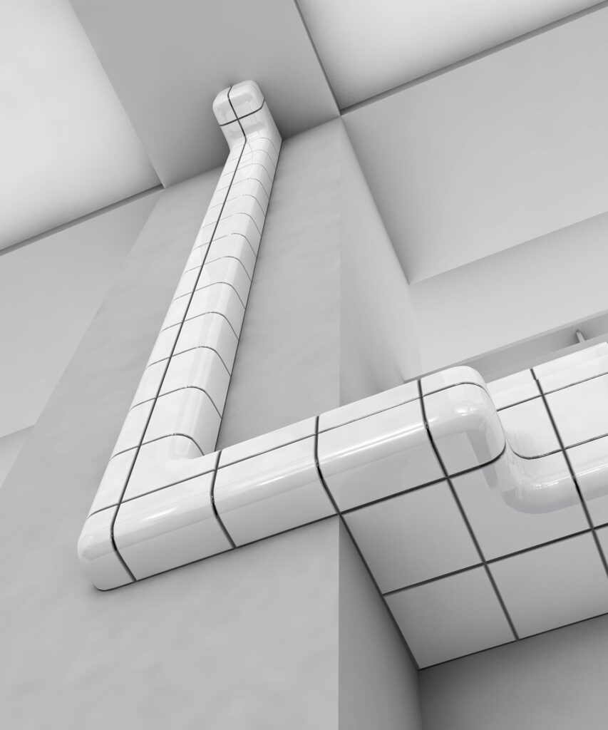 In an artistic context, DEVICE designates an intermediate state between sculpture and a functional instrument. Built from tiles featuring curves, coves, an openly legible assembly emerges on the basis of module, standard, and series, mediating between craft-based construction and industrialized technology. Its modular logic reflects planning, surveying, and assembling as the institution’s core practice; the orthogonal grid of joints signals program, while the parasitic routing along the building body turns the architecture into a carrier for the device.
