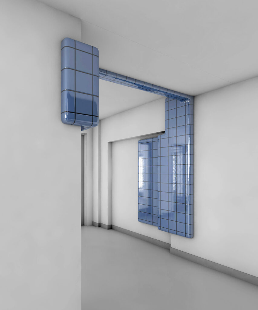Das zweigeschossige Foyer und das Treppenhaus fassen die GERÄTE nicht als Bilder, sondern als Beobachtungs- und Durchgangsobjekte: Apparate, die den Raum abstimmen statt ihn zu zeigen. Die Kachel-Körper erscheinen wie dienende, messende, doch sinnoffene Elemente; ihr Zweck entzieht sich und versetzt die Betrachtenden in die Rolle der Interpretinnen und Interpreten. So verschiebt die offene Funktionalität die Deutung vom Bedienen zum Interpretieren und hält Vergangenheit, Gegenwart und Möglichkeit zugleich präsent. Die differenzierten Farben unterstützen diese Haltung: verschieden pastellig treten die drei Objekte nicht als Dekoration, sondern als Teil der Architektur auf. Jede Farbe markiert eine andere imaginäre Funktion.